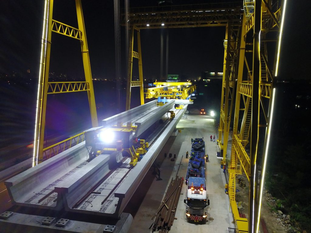 Proses pemasangan jalur LRT Jabodebek Ruas Cawang– Bekasi menggunakan metode Gantry Crane Transporter Beam Launcher